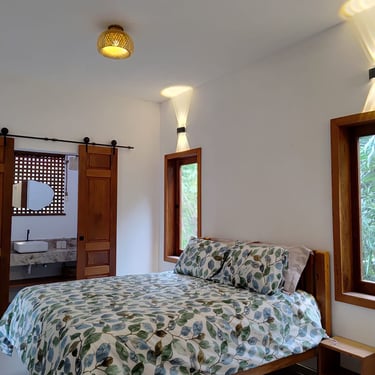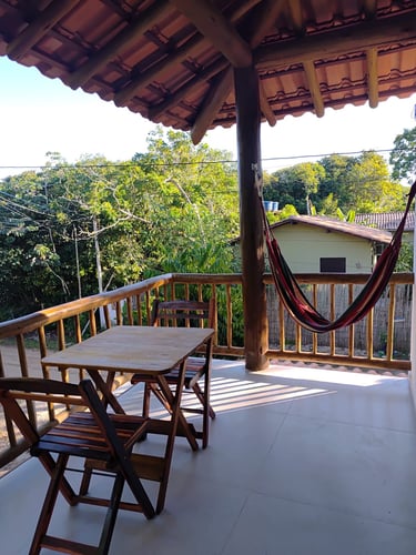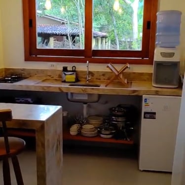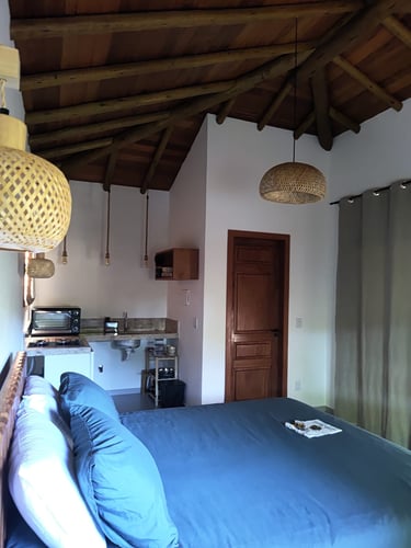 Ideal para casais, este studio conta com uma cama Queen, banheiro privativo e uma mini cozinha equipada com fogão, forno elétrico e todos os utensílios necessários para preparar suas próprias refeições. A sacada oferece uma mesa e uma rede, perfeita para relaxar ao som dos pássaros e apreciar a tranquilidade do vilarejo.